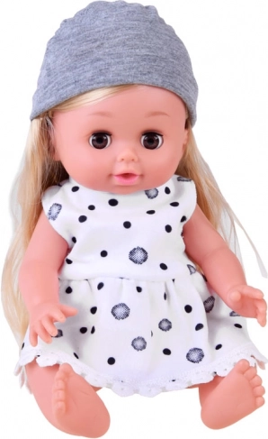 Die Puppe ist wunderschön mit braunen Augen und langen blonden Haaren. Sie trägt ein niedliches weißes Kleid mit Punkten und eine dünne graue Mütze – ideal für Spaziergänge. Die Augen der Puppe schließen sich, sodass sie auch schlafen kann. Der Körper des Spielzeugs ist aus Kunststoff, der Kopf, die Arme und die Beine sind aus Gummi.