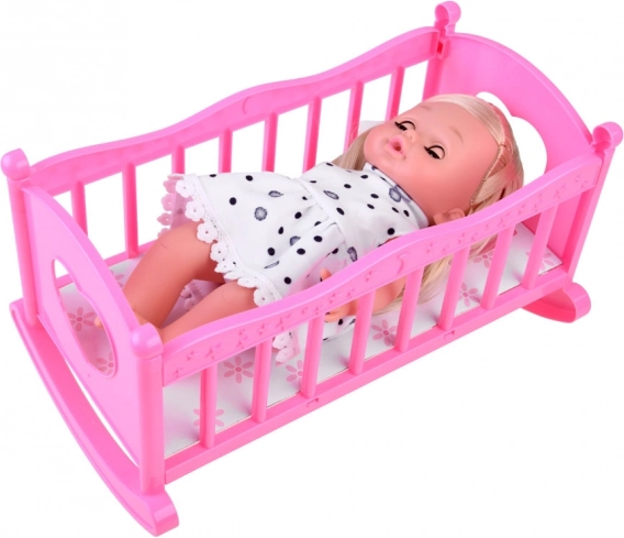 Nach dem Essen ist es Zeit für eine Pause in der praktischen Wiege. Der Rahmen ist aus Kunststoff, der Boden aus starkem Karton mit Blumenmotiv. Auf dem rosa Rahmen sind Sterne und ein Mond eingraviert.