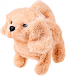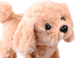 Der weiche beige Hund läuft, bellt, wedelt mit dem Schwanz und gibt beim Streicheln Welpenlaute von sich – fast wie ein echtes Hündchen.