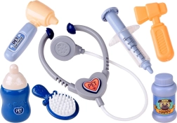 - Plüschhund, Transporter mit Griff, Stethoskop, Spritze, Otoskop, neurologischer Hammer, Bürste, Fläschchen, Medikamentenimitate