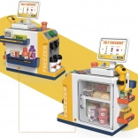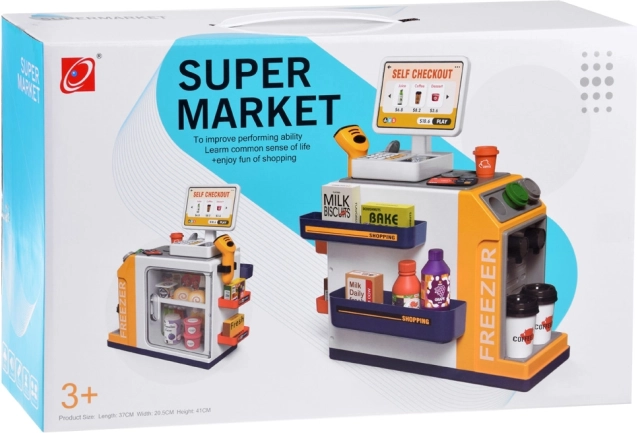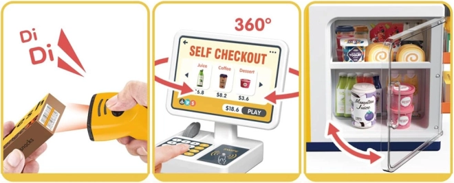 Diese realistische Selbstbedienungs-Kasse mit Kaffee-Ecke verwandelt das Kinderzimmer in einen kleinen Supermarkt. Kinder probieren die Bedienung von Kunden, die Zubereitung von Kaffee, das Scannen von Waren und das Bezahlen mit Karte oder „bar“ aus. Integriertes Gefrierfach/Kühlfach für Desserts und Getränke, farbige Tasten und Display sorgen für ein authentisches Erlebnis.