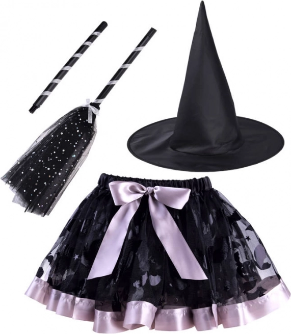 Set-Inhalt: spitzer schwarzer Hut, bauschiger Rock mit Gummibund und faltbarer Besen. Perfekt für Kinderpartys, Karneval und Schulaufführungen.
