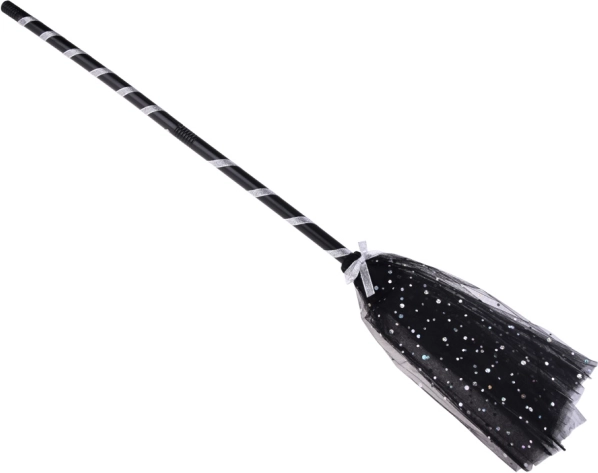 Spitzer schwarzer Hut, bauschiger Rock mit Gummibund, faltbarer Besen