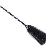 Faltbarer Besen mit schwarz-weißem Spiraldesign und dekorativen Fransen verleiht dem Kostüm eine verspielte Note.