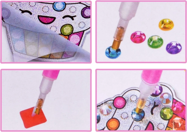 Dieses Set ermöglicht das Erstellen von 12 wunderschönen Aufklebern mit leuchtenden Diamanten. Es reicht aus, die richtige Farbe auszuwählen und die Teile mit einem speziellen Applikator auf die Klebeschablone zu setzen. Das Ergebnis ist eine schöne und bunte Dekoration.