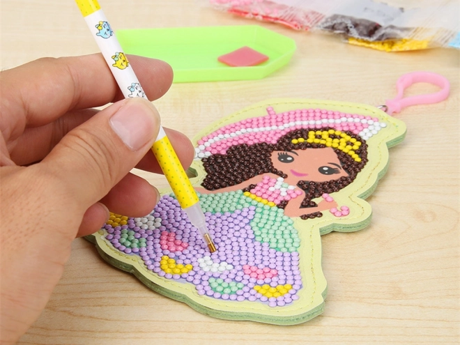 Kreatives Set mit Diamant-Stickern ermöglicht es, ein wunderschönes Dekor mit bunten Diamanten zu kreieren. Das Set enthält eine Geldbörse mit Anhänger, einen Aufkleber, dekorative Elemente und weiteres Zubehör.