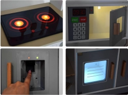 Bewegliche Komponenten wie Knöpfe, Türen, Tasten und Uhren fördern die Feinmotorik und Bewegungskoordination.