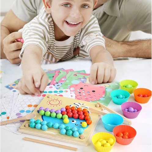 Holz-Lernmosaik für Kinder ist großartiger Spaß und ein Training für den Kopf. Dieses Set ermöglicht das Üben von Konzentration, Aufmerksamkeit, Farberkennung, Handtraining, motorischen Fähigkeiten und bringt viele positive Emotionen. Es ist ein Lernspielzeug für kleine Kinder, das hilft, Formen und Farben zu lernen, zu zählen sowie Hand-Auge-Koordination zu entwickeln.