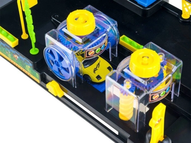 Kinder können ihre Fahrzeuge in der bunten Waschanlage mit Bürsten und Durchfahrtsstationen gründlich „waschen“ – Spaß und Förderung der Koordination.