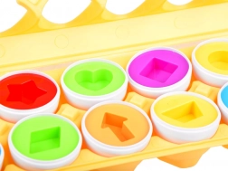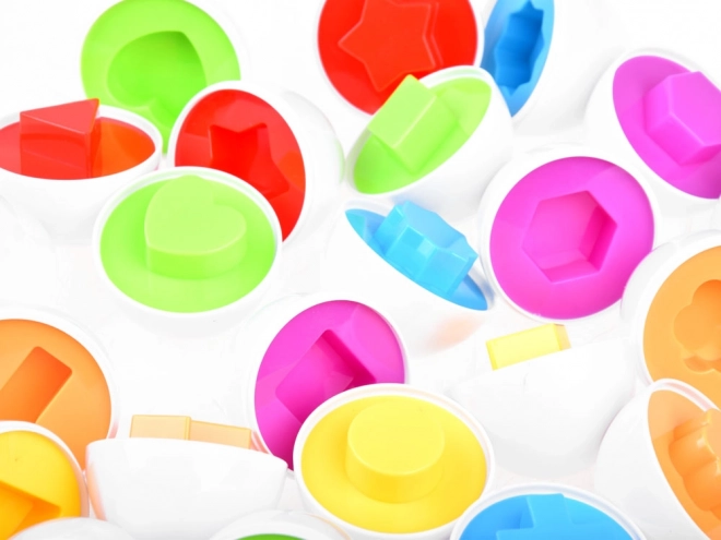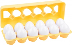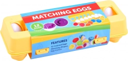 Dieses durchdachte Set enthält 12 weiße Eier, die in einem gelben Kunststoff-Tablett verstaut sind. Im Inneren finden Kinder verschiedenfarbige Hälften mit Formen, die nach Farbe und Form richtig zugeordnet werden müssen (z. B. Stern, Herz, Kreis, Quadrat und weitere). Das Spiel fördert die frühe Kompetenzentwicklung, lehrt Geduld und Konzentration.