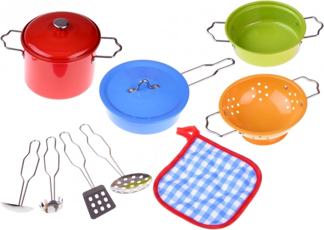 Farbenfrohes Metall-Set für kleine Köche bringt realitätsnahes Kochspiel. Enthält Töpfe, Pfanne, Seiher sowie Utensilien und ist ideal zur Förderung von Fantasie, Feinmotorik und Rollenspiel in der Kinderküche.