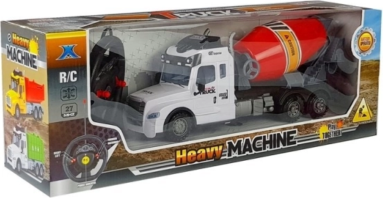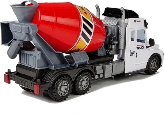 .Ferngesteuertes Baufahrzeug für Kinder ist mit profilierten Kunststoffrädern ausgestattet, die das Spielen auf verschiedenen Oberflächen ermöglichen. Der weiße Betonmischer mit roter Trommel ist mit kontrastierenden schwarzen Details sowie auffälligen Aufklebern verziert.