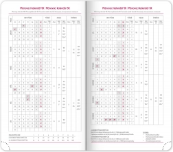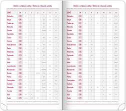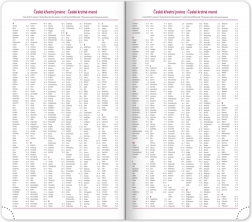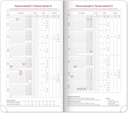 Der Kalender bietet ein übersichtliches Wochen‑Layout mit tschechisch‑slowakischem Kalendarium und zusätzlichem Englisch, Deutsch, Ungarisch und Russisch. Monats‑ und Jahresplaner, eine Übersicht der Feiertage, eine erweiterte Liste tschechischer Namen sowie Karten fehlen ebenso wenig. Abgerundete Ecken, Textillesezeichen und perforierte Ecken erleichtern die tägliche Nutzung, die Möglichkeit der Prägung von Jahreszahl und Logo erfreut Firmen und anspruchsvolle Nutzer.
