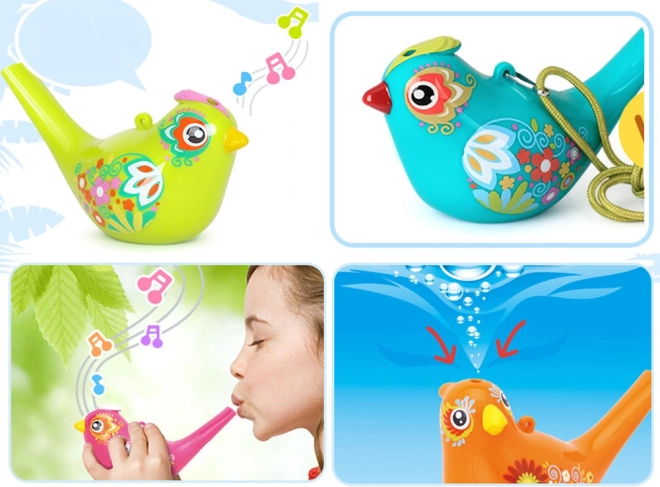 Niedliche Plastikpfeife in Form eines Vogels, die nach Zugabe von Wasser verschiedene Töne erzeugt. Dank der farbigen Verzierungen und der einfachen Handhabung bietet sie Kindern viel Spaß und fördert musikalisches Gehör sowie Atemkontrolle.