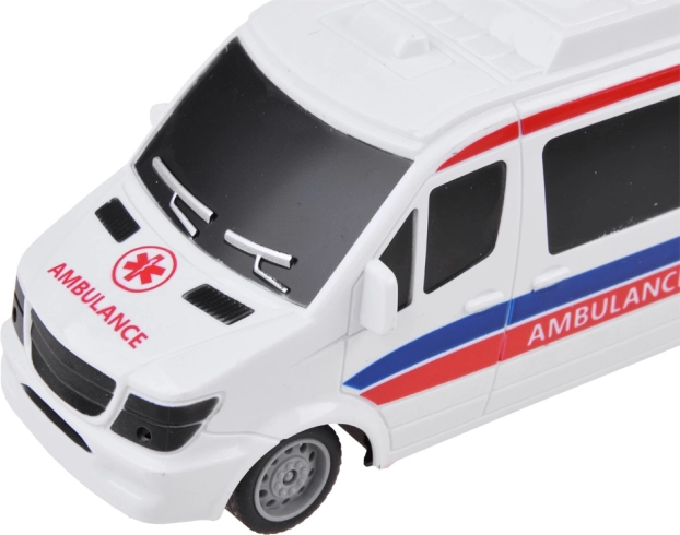 Dieses Krankenwagenmodell überzeugt mit einem realistischen Design, einschließlich Details wie Fenstern, Türen und medizinischen Symbolen an den Seiten.