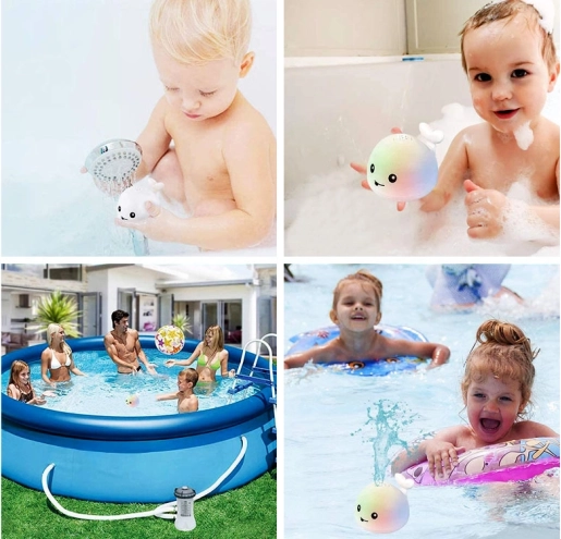 Beim Eintauchen startet der Wal automatisch und erzeugt einen kleinen Wasserstrahl mit wechselnden Farben – fesselt sofort die Aufmerksamkeit und sorgt bei jedem Bad für Spaß.