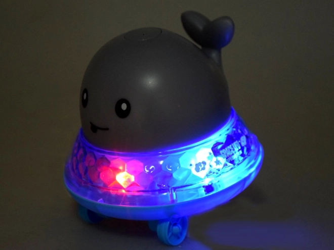 Außerhalb des Wassers setzen Sie den Wal auf die Plattform, schalten on/off um und beobachten die Fahrt im Takt fröhlicher Musik mit Lichteffekten.
