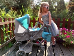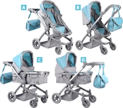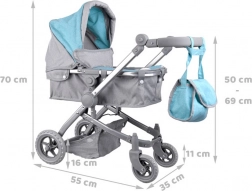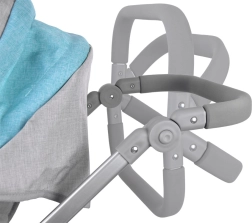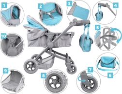 Zur praktischen Ausstattung gehören ein klappbares Verdeck, eine verstellbare und weich gepolsterte Schiebestange, Sicherheitsgurte für die Puppe, ein geräumiger Unterkorb sowie eine passende abnehmbare Tasche für das Nötigste. Die Vollräder aus EVA sind leise und pflegeleicht.