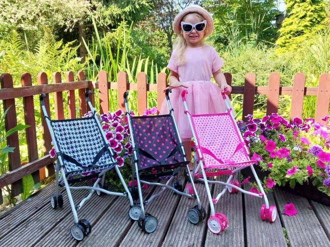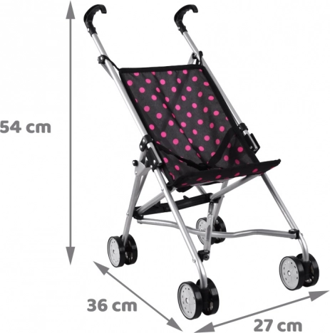 Leichter und kompakter Puppenwagen in Schwarz mit rosa Punkten, der jedes Kind begeistert. Dank der stabilen Metallkonstruktion, bequemen Griffen und doppelten Rädern für sanftes Fahren ist er leicht zu lenken und sicher für den täglichen Spielspaß.