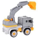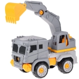Enthalten sind ein Schraubendreher und eine Ersatzschraube. Kinder können Räder, Frontmaske, Kabine mit Arm sowie Schaufel abschrauben und alles wieder zusammenbauen.