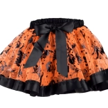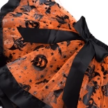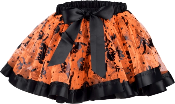 Leichter orangefarbener Rock mit schwarzer Einfassung und Prints von Kürbissen, Katzen, Hexen und Sternen betont jede Bewegung.