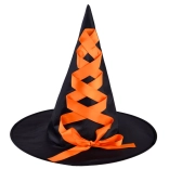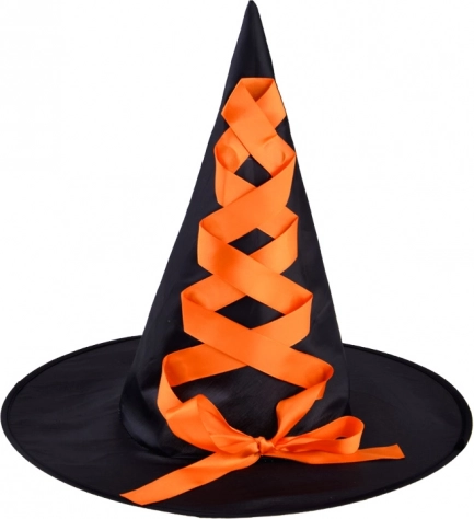 Der klassische schwarze Hexenhut mit orangefarbenem Satinband verleiht dem Kostüm einen authentischen Look und behält seine Form sehr gut.
