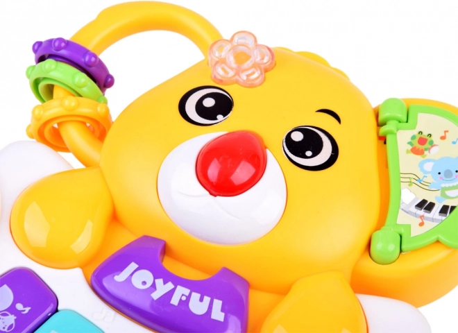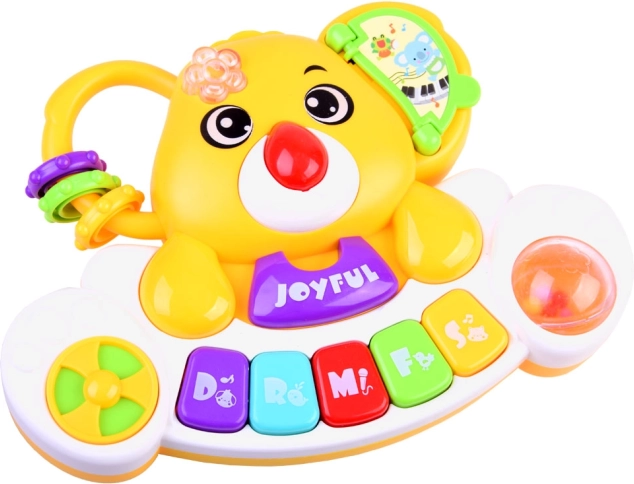 Das niedliche Kinderklavier in Bärenform begeistert Babys und Kleinkinder. Es bietet mehrere Spielmodi mit Tönen, Melodien und Tiergeräuschen, ein farbig beleuchtetes Lämpchen sowie interaktive Elemente zur Förderung der Feinmotorik.