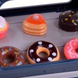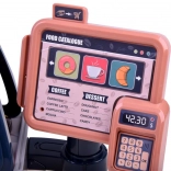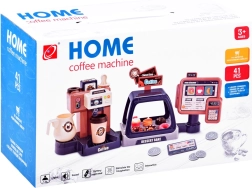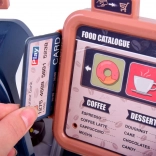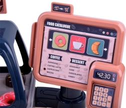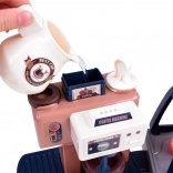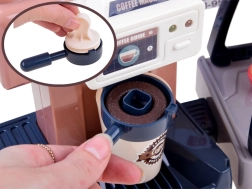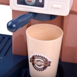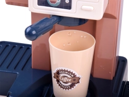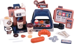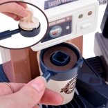 Dieses realistische Set ermöglicht Kindern, ihr eigenes Café zu eröffnen: Sie bereiten „Espresso“ zu, stellen Leckereien in die Vitrine und tippen die Bestellung an der Kasse ein. Die Kaffeemaschine mit Wasserfluss „brüht“ nach dem Einfüllen von Wasser oben und dem Einsetzen des Siebträgers Kaffee mit Lichtsignal (rot während der Zubereitung, grün nach Abschluss) sowie Mahl- und Ausgießgeräuschen. Die Kasse hat ein Drehpanel, piept bei Kartenzahlung und gibt beim Öffnen einen Ton ab.