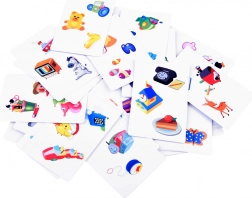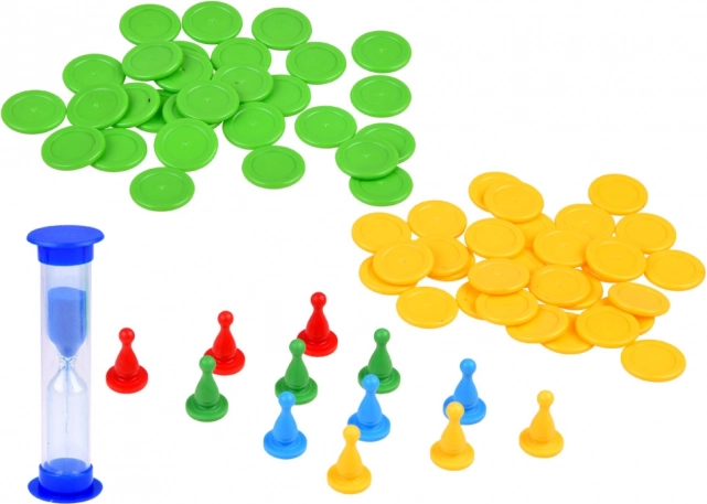 Spielregeln:Das Spiel beginnt mit dem Zusammenbau des Spielbretts in der Mitte des Spielbereichs. Anschließend werden die Karten je nach Anzahl der Teilnehmer verteilt: 2 Personen – 8 Karten pro Spieler, 3 Personen – 6 Karten pro Spieler, 4 Personen – 5 Karten pro Spieler. Die Karten bleiben mit der Bildseite nach unten liegen und dürfen nicht angesehen werden. Jeder Spieler erhält 3 Figuren zum Markieren gefundener Elemente, und es wird eine Person bestimmt, die nach jeder Runde die Chips austeilt.