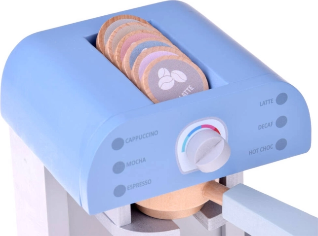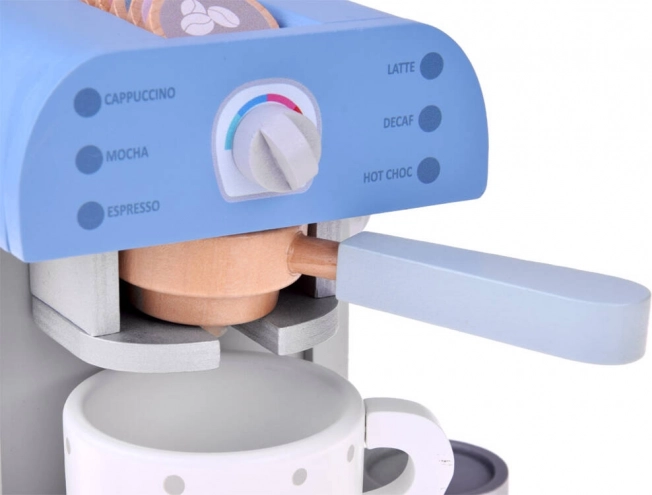 Holzspielzeug-Kaffeemaschine für Kinder in elegantem Blau ist das perfekte Spielzeug für jede Kinderküche. Dieses stilvolle und hochwertig hergestellte Set umfasst eine Kaffeemaschine und Zubehör, die unterhaltsames und lehrreiches Spielen gewährleisten.