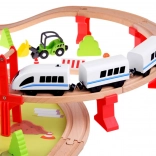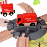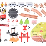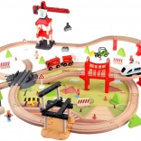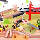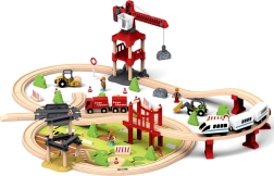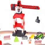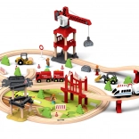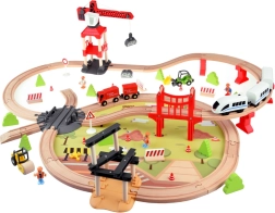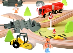 Die Einzigartigkeit dieses Sets liegt im funktionellen Kran und elektrischen Zug, der Vor- und Rückwärtsfahren ermöglicht. Im Paket sind auch Figuren von Menschen, Verkehrsschilder, Büsche und Teile für den Bau einer Brücke und weiterer Konstruktionen. Die meisten Teile sind präzise aus sicher lackiertem Holz mit schönen natürlichen Tönen gefertigt.