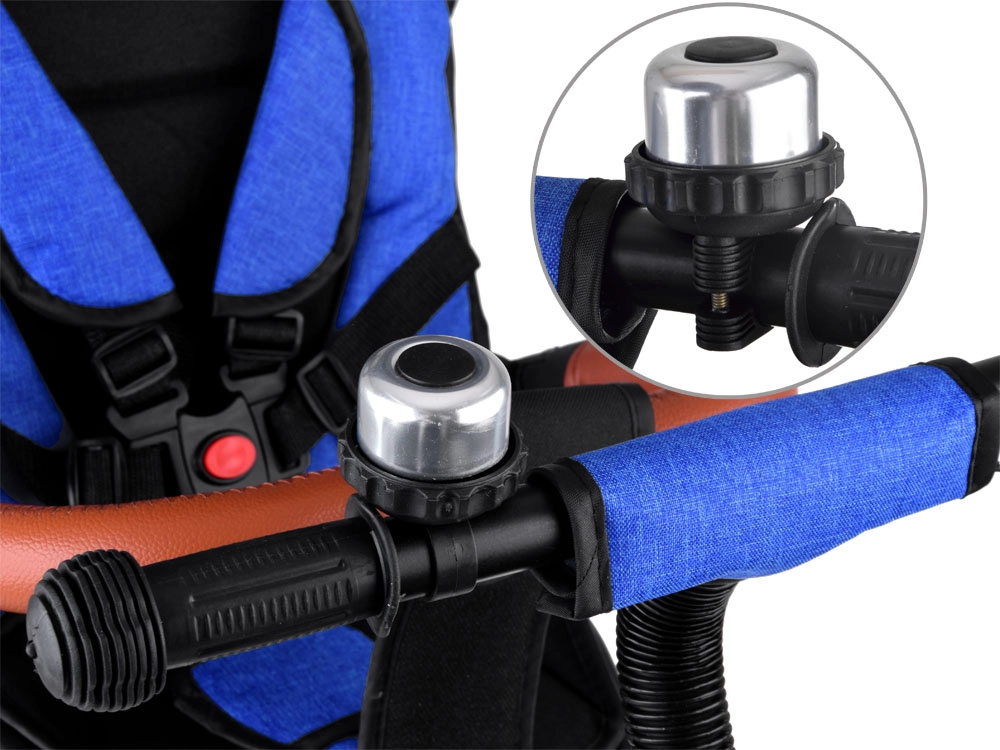 - drehbarer Sitz, 5-Punkt-Gurte, Schutzbügel, klappbares Verdeck mit Netz, Fußstützen, Pedale, Klingel, 2 Körbe, Tasche für Eltern