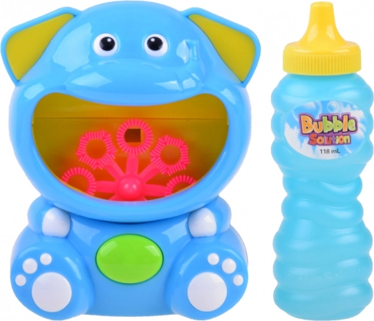 Gießen Sie die Lösung in die Öffnung, drücken Sie den Knopf am Bauch des Elefanten und beobachten Sie, wie sich die Scheibe dreht und ein Strom regenbogenfarbener Bläschen herausfliegt.