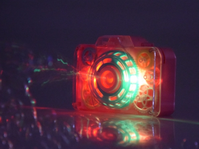 Realistisches Verschlussgeräusch und bunte Lämpchen vermitteln das Gefühl „echten“ Fotografierens und steigern den Spielspaß.
