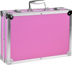Aufbewahrt in einem rosa und schwarzen Koffer, der einfache Transportierbarkeit und Ordnung gewährleistet.