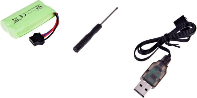 Im Lieferumfang sind ein 7,4‑V‑500‑mAh‑Akku und ein USB‑Kabel. Schnell aufladen und zurück ins Geschehen.