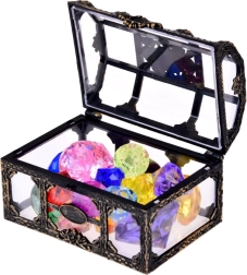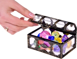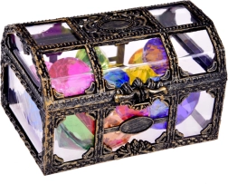 Bringen Sie Glanz und Fantasie ins Spiel – die Piratentruhe mit transparenten Seiten und Vintage-Verzierungen birgt 17 kräftig gefärbte, facettierte Kristalle. Kinder können sie aus der Badewanne oder dem Pool angeln, im Garten nach Karte suchen oder sie als „Beute“ in Rollenspielen verwenden.