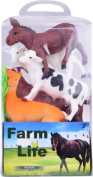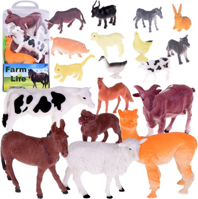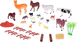 Kuh, Pferd, Hund, Esel, Schaf mit Lamm, Ziegen, Alpaka, Schwein, Büffel, Katze, Kaninchen, Ente und Henne, ergänzt durch Zaun, Heuballen, Stämme, Busch und eine Spielunterlage.