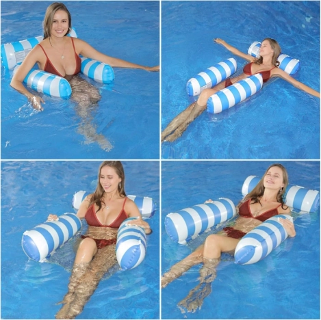 Verabschieden Sie sich von der gewöhnlichen Luftmatratze und begrüßen Sie die einzigartige Lösung – eine Hängematten-Liege, ideal für heiße Sommertage. Sie ist so konzipiert, dass ein teilweises Eintauchen ins Wasser möglich ist, sodass Sie beim Sonnenbaden stets angenehm gekühlt bleiben. Die Liege ist mit aufblasbaren Elementen aus strapazierfähigem PVC ausgestattet und mit einem Nylonnetz verbunden, um maximalen Komfort zu bieten. Ihr elegantes blau-weißes Design wird zum Hingucker auf Ihren Urlaubsfotos.