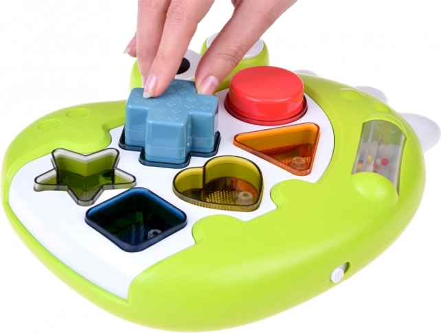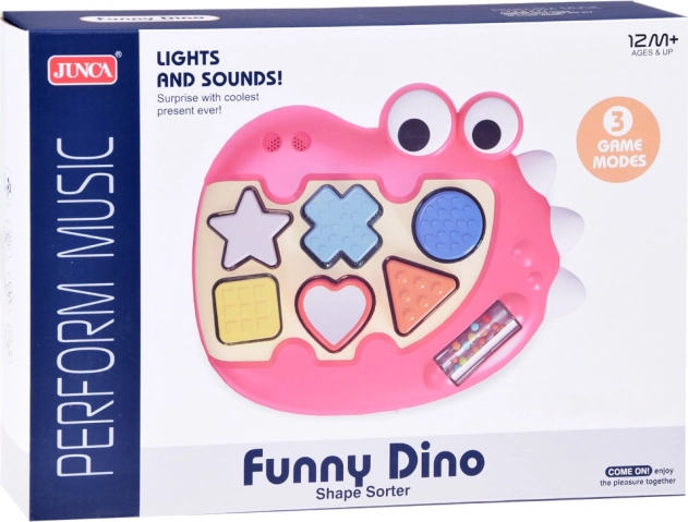 Dieser lächelnde Dinosaurier besitzt verschiedene Formöffnungen: Dreieck, Quadrat, Kreis, Herz, Stern und Kreuz, in die das Kind die passenden Teile einsetzen muss. Jedes Teil hat eine andere Farbe und Textur, was das Spiel sinnlich interessant macht. Einige der Teile enthalten Perlen, die beim Schütteln Geräusche machen.