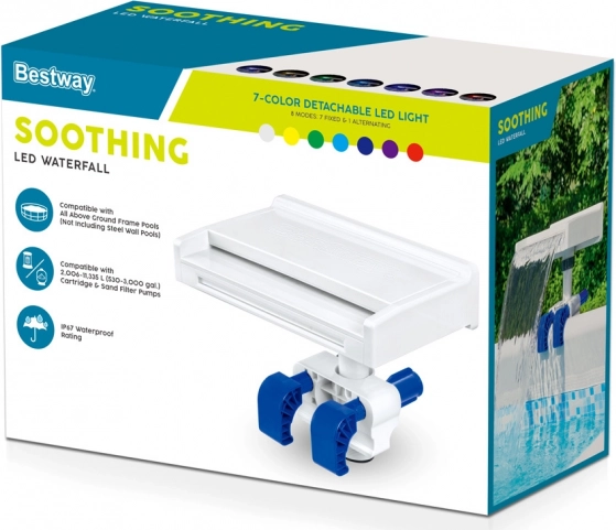 Beleben Sie Ihren Pool mit dem Bestway Flowclear Wasserfall mit LED‑Beleuchtung, der nicht nur Kindern Freude bereitet, sondern auch Erwachsenen beim Baden im heimischen Pool Entspannung bietet. Dieser einfach zu bedienende Wasserfall kann an allen Rahmenpools mit einer Filterpumpe mit einer Förderleistung von 2.006 bis 11.355 l/h montiert werden.