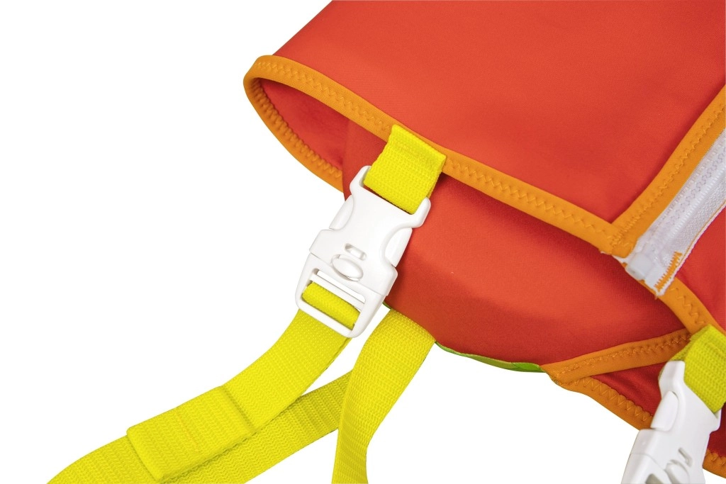 Die große Kopfstütze hilft, den Kopf des Kindes über Wasser zu halten; verstellbare Gurte mit Schnellverschlussschnallen und ein Schrittgurt gewährleisten einen festen und sicheren Sitz. Ein praktischer hinterer Griff ermöglicht es, das Kind leicht festzuhalten oder schnell aus dem Wasser zu heben.