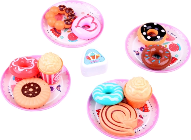Bunte Donuts, Cupcakes und Kekse fördern Fantasie, Wortschatz und soziale Fähigkeiten beim Rollenspiel als Café oder Konditorei.