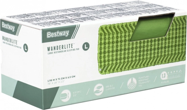 Die aufblasbare Isomatte BESTWAY WanderLite Large ist ein zuverlässiger Begleiter für Camping, Trekking und Festivals. Dank der großzügigen Maße von 198 × 71 × 6,5 cm passt sie perfekt zu größeren Schlafsäcken und bietet komfortable Isolation und Unterstützung auf unebenem Untergrund. Die Materialkombination aus ToughLite und 70D Ripstop-Nylon sorgt bei geringem Gewicht für hohe Widerstandsfähigkeit gegen Abrieb und Risse.