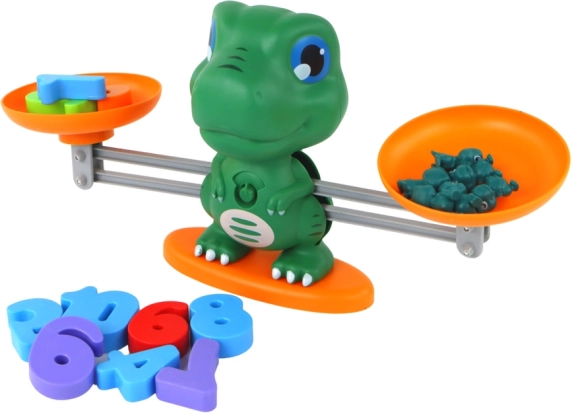 Die Dinosaurierwaage mit zwei Schalen hilft Kindern zu verstehen, wie sich Zahlen und Mengen ausgleichen. Ideal für die erste Begegnung mit den Begriffen mehr/weniger und gleich.