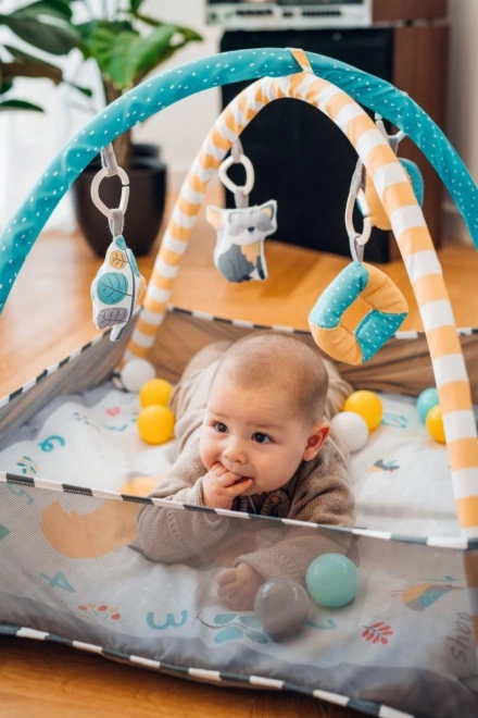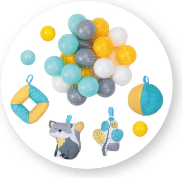 Die Lernmatte fördert die Entwicklung der Fein- und Grobmotorik. Die Spielzeuge auf der Matte sollten so weit wie möglich voneinander entfernt platziert werden, damit das Kind versucht, danach zu greifen, sie zu fassen und sich zu bewegen. Die Spielzeuge der MoMi LAMMIS Matte sind an jeder Seite aufgehängt, was das Kleinkind zur Bewegung anregt, und sie sind vielfältig, sodass es nach einiger Zeit Lust auf neue Reize hat. Knister- und Quietschspielzeuge animieren zudem die Hände Ihres Kindes zum Handeln. Dank der Bällebad-Funktion bietet die Lernmatte MoMi LAMMIS Ihrem Kind jede Menge Spaß.