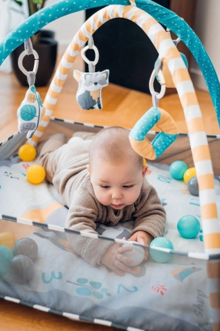 Der Laufstall ermöglicht Ihnen eine kurze Verschnaufpause. Das Netzgeländer schafft einen sicheren Raum und verhindert, dass das Kleinkind die Matte verlässt. Das Bällebad sorgt für jede Menge Spaß. Dadurch bleibt die Matte auch für ältere Kinder attraktiv. Das Set enthält 18 Bälle in zarten Farben.