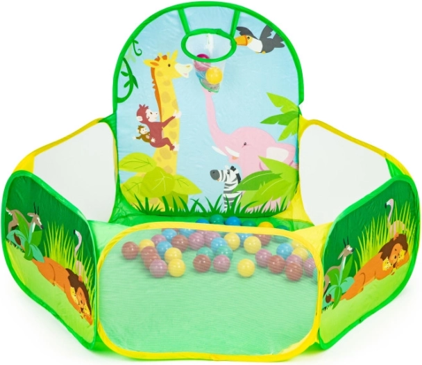 Zum Set gehören 50 Kunststoffbälle (Ø 6 cm), die das Zelt in ein spaßiges Trockenballbad verwandeln. Der integrierte Wurfkorb motiviert zur Bewegung und fördert Koordination und Zielgenauigkeit. Der robuste Boden ist für das Spielen drinnen und draußen ausgelegt.