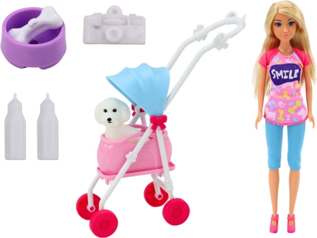 Puppe Anlily mit schönen langen Haaren und bunter Kleidung ist die ideale Begleiterin für kleine Tierpfleger. Mit ihr können sich Kinder in die Rolle verantwortungsbewusster Besitzer hineinversetzen, die den Hund ausführen und sich durch Füttern und Spielen um ihn kümmern.