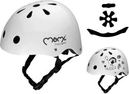 Leichter und sicherer Kinderhelm MoMi MIMI in Weiß für Fahrrad, Roller, Laufrad und Inlineskates. Er bietet eine robuste ABS-Außenschale, stossdämpfendes EPS-Innenmaterial, 11 Belüftungsöffnungen und eine präzise Größenverstellung 48–55 cm für maximalen Komfort und Schutz.